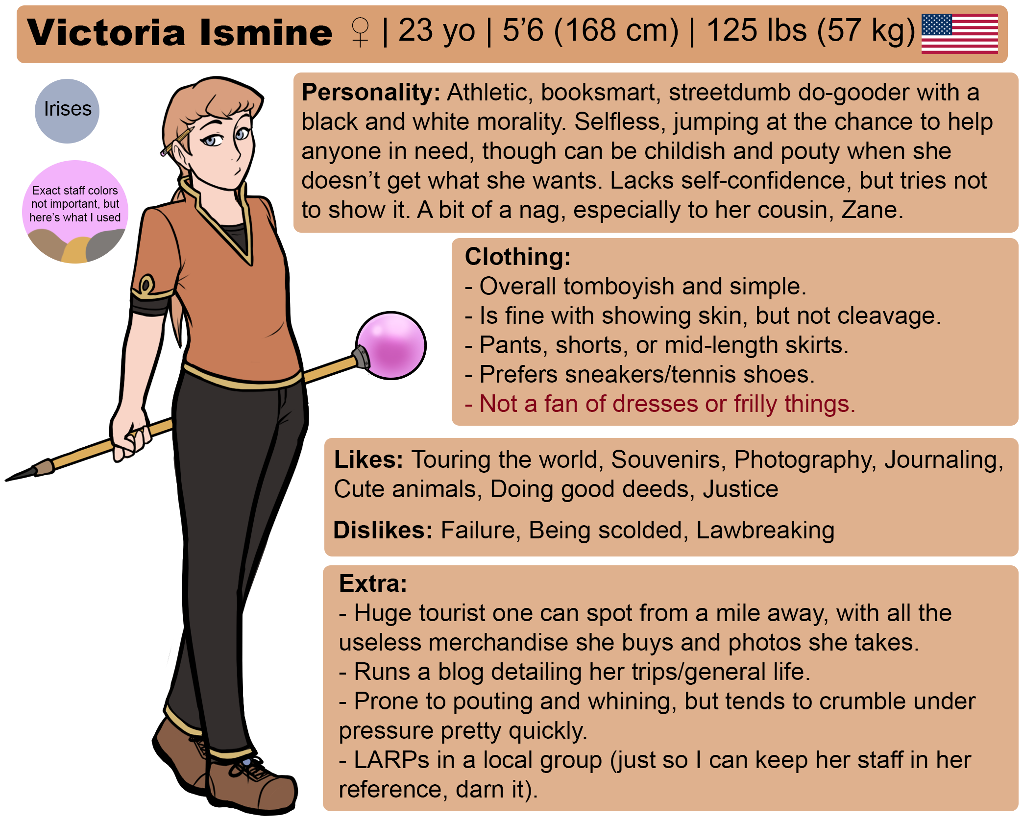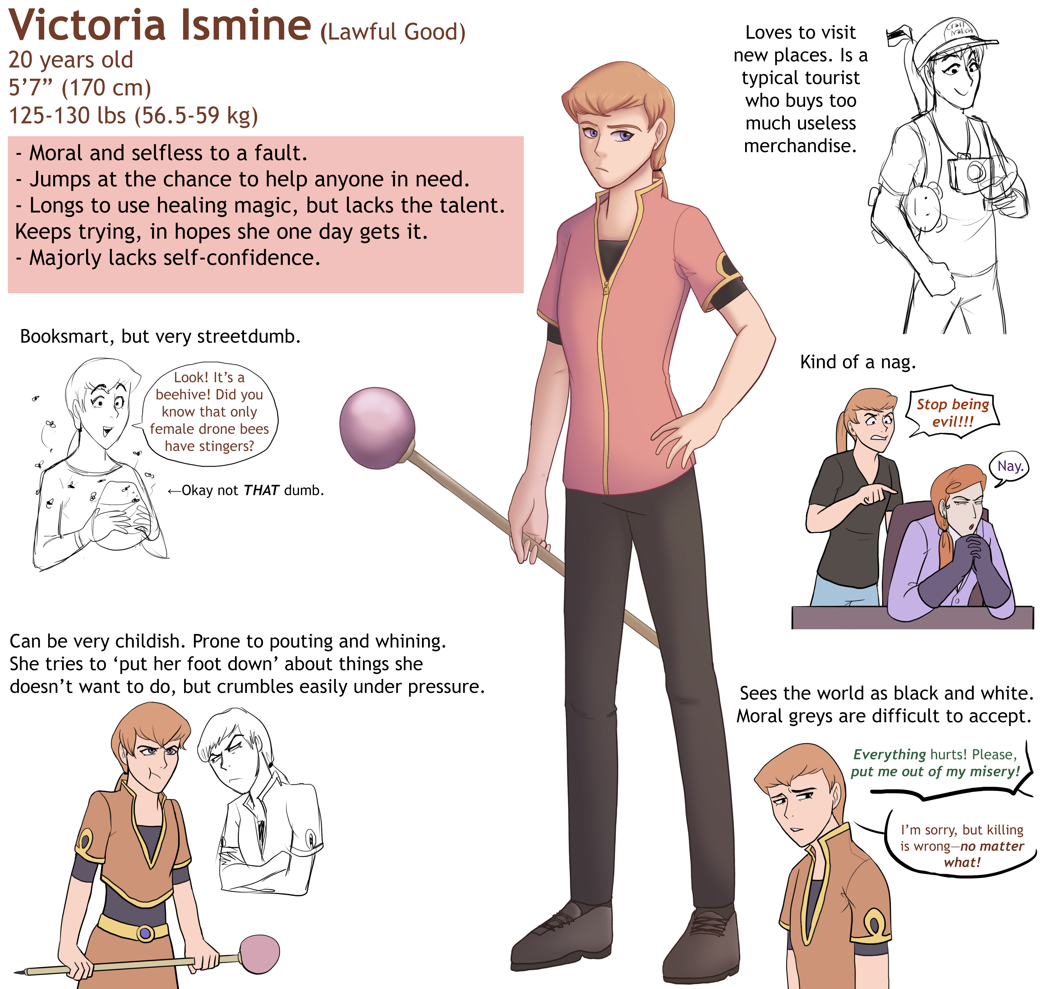 Victoria has a very strong sense of justice, but doesn't have very good judgement to go along with that. She sees the world as black and white, and finds it hard to accept that there are oftentimes moral greys—at least not without someone pointing them out to her first.