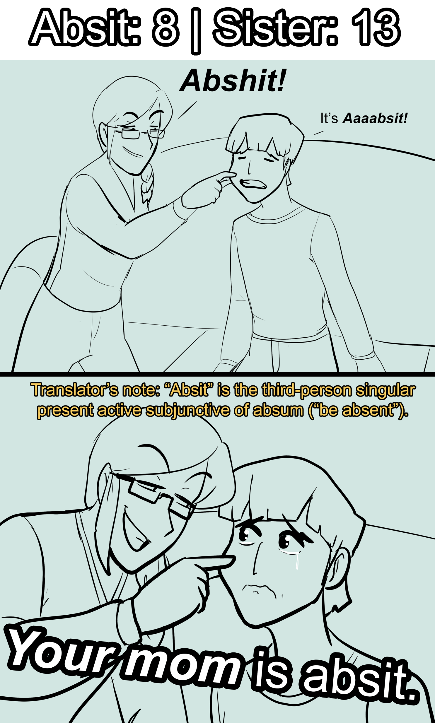Through her, he gains a bit more confidence, still a complete pushover, but a little more talkative with less total freakouts at the smallest of errors. He's not invited to his sister's wedding (17 years old), but is surprised when he's invited to his brother's (23 years old). Him and his brother minorly reconnect and come to terms with each other, though his sister is still dismissive and standoffish, blaming Absit for 'being selfish' for still letting stuff from their childhood get to him, telling him to 'grow up.' He apologizes and says he doesn't know how to.