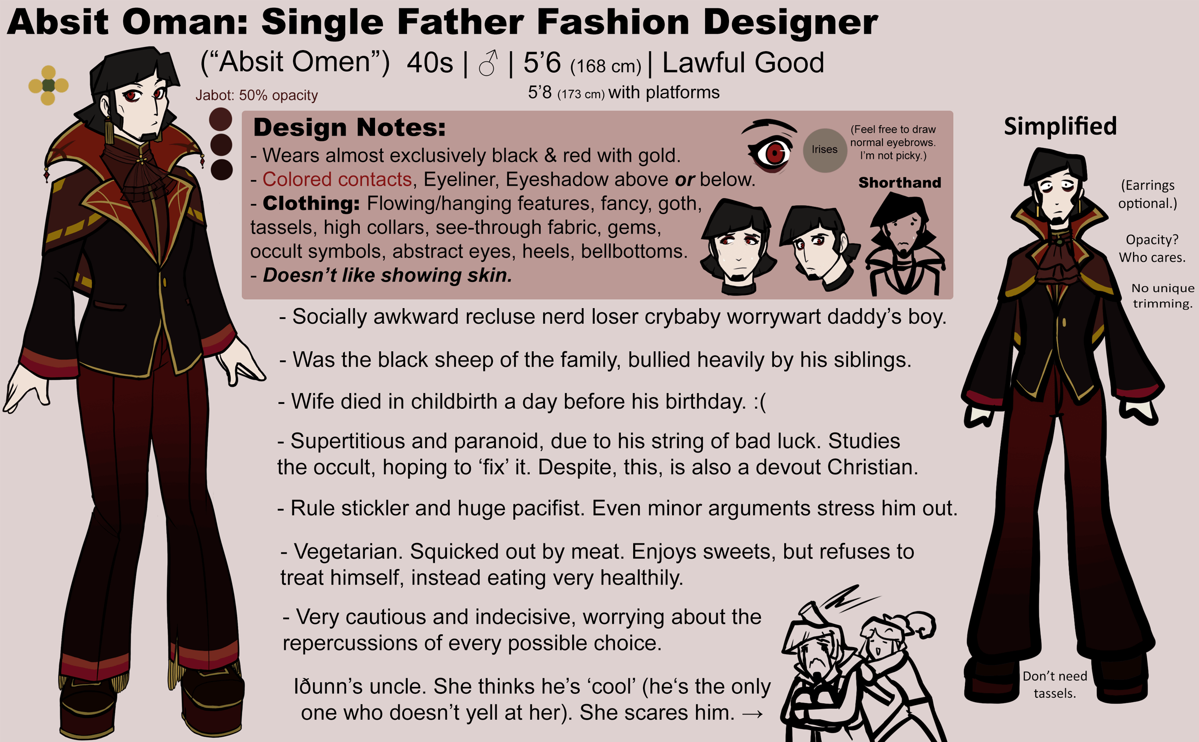 From then on, he lives for her sake, doing whatever he can to live up to what she wanted him to be, so she could still exist in this world in some form. He's a great father, all things considered, aside from his frequent anxiety attacks and sobbing breakdowns. His son, while rather aloof himself, supports him in turn, and is the replacement motivator in his life when Absit is too miserable to figure out what the love of his life would want him to do in any given situation.