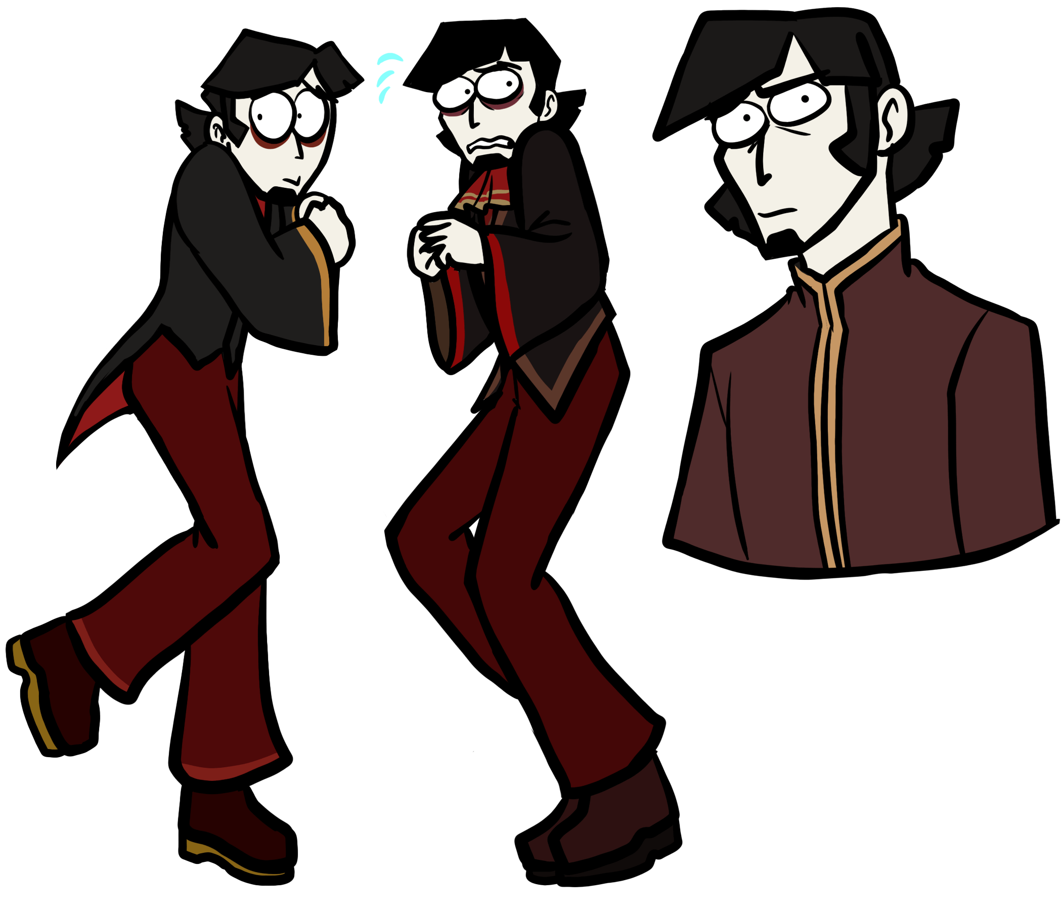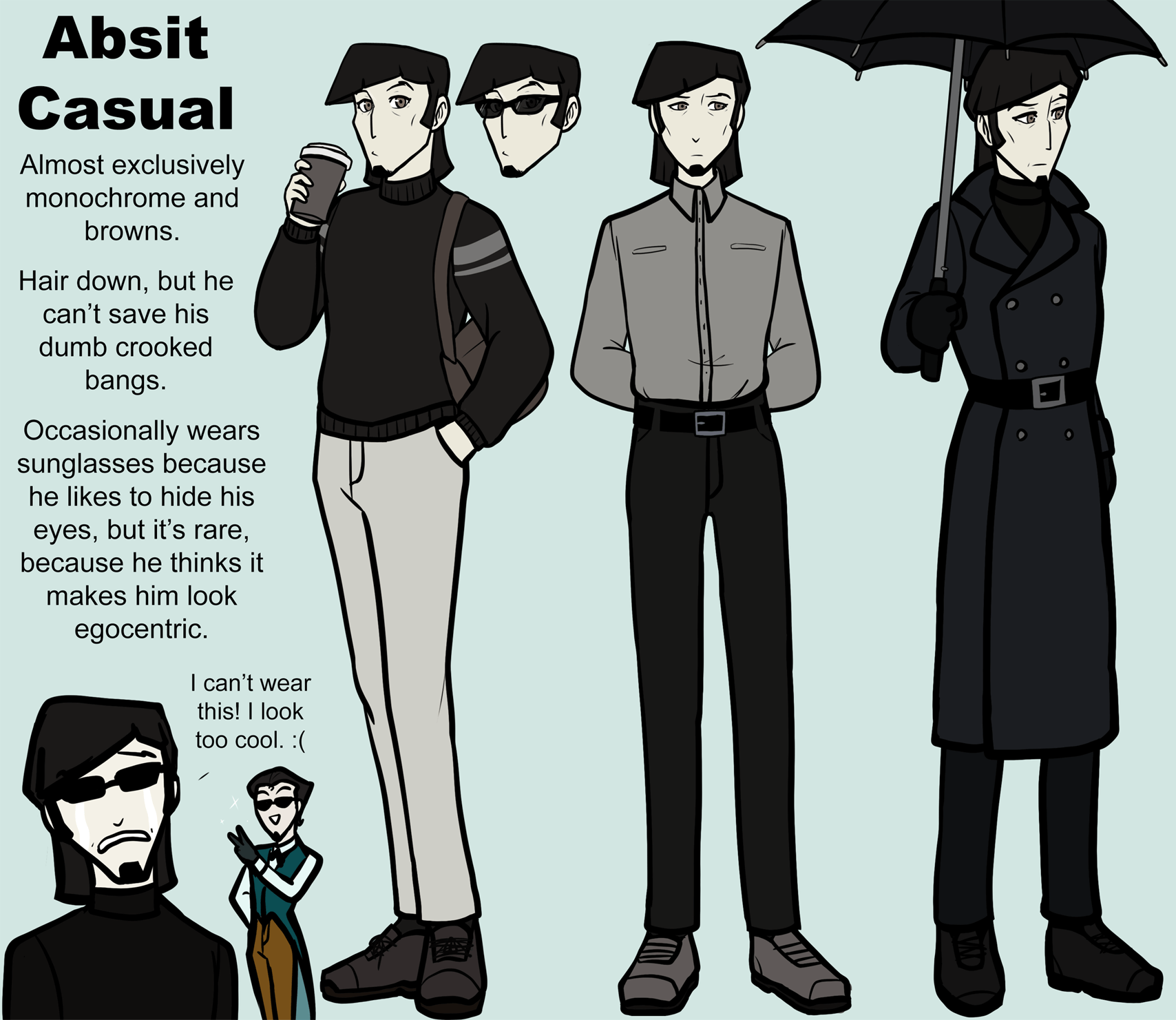 Absit's backstory varies between stories, but in every canon, he's an unlucky, timid crybaby single father whose wife died in childbirth. He grew up very close to his father, but was heavily bullied by his other siblings, making him the closed off, apologetic man he is today: a man who never wants to waste even a second of someone else's time to help him, even if it's their job to do so. He's extremely passive and has a hard time making decisions, as he worries about the consequences for either choice he makes.