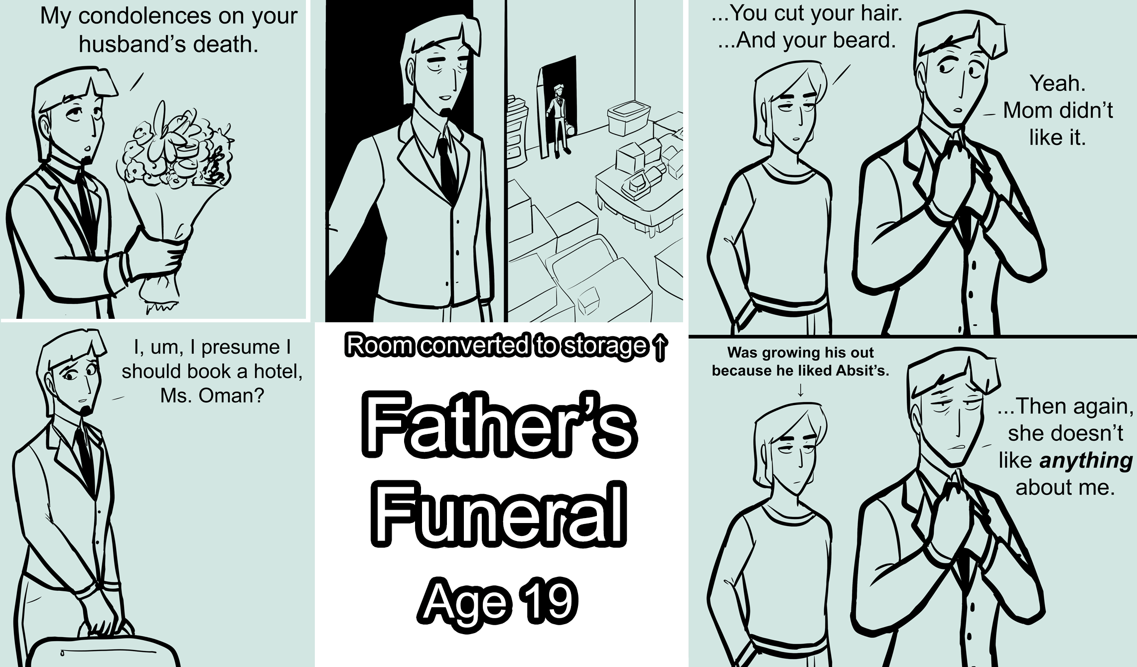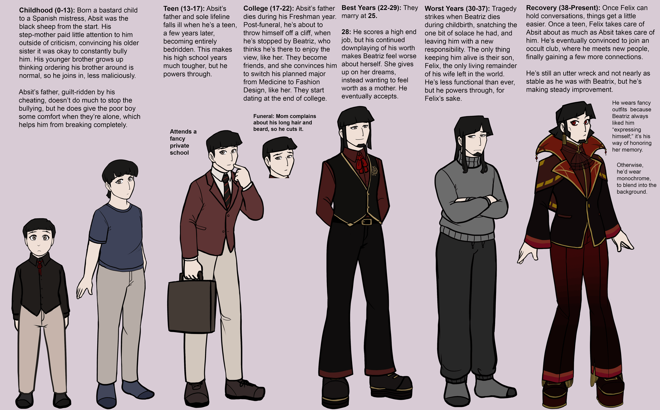 Absit was born a bastard child to a married man, making him the black sheep of the family from his conception. His mother never thought of him as a son, electing to ignore his existence whenever possible, while his older sister heavily bullied him (for a host of reasons), and his later younger brother was apathetic to it all, but extremely blunt, leading to his own accidental bullying. As such, Absit clung to his father, the one person in the family who took the time to care for him, even if it was partially out of guilt. Regrettably, by the time he was 13, his father started getting frail [I don't have a condition in mind right now], leading to him spending frequent days in the hospital. Despite the stress the entire family should have been suffering from, the bullying didn't let up, leading him further and further into reclusion.