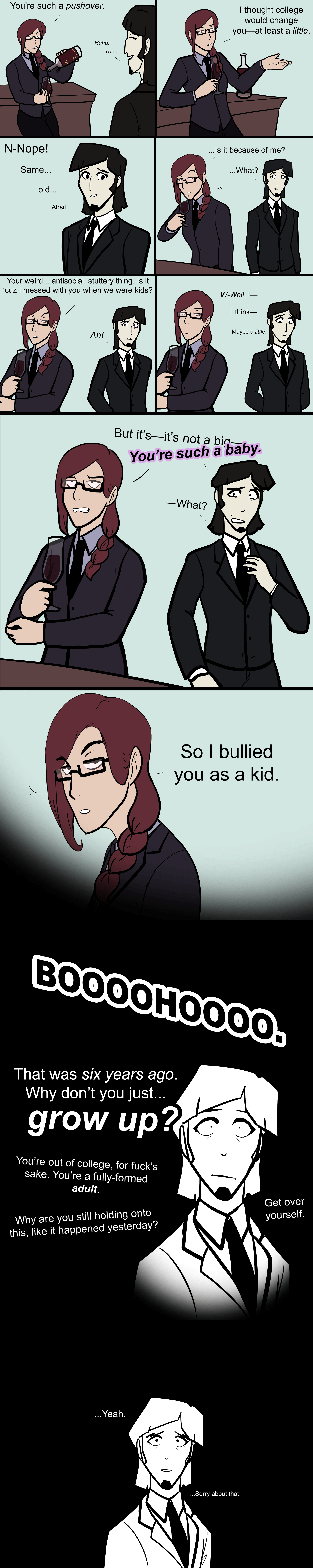 (His siblings messed him up. His wife helped slowly break him out of his shell, but then she died a day before his birthday, leaving him with a newborn baby to take care of, which broke him again. Whoops. At least he's not bullied by his family anymore—though he's too traumatized to notice they're not bullying him (they're more apathetic than anything else now, just making occasional rude quips).)