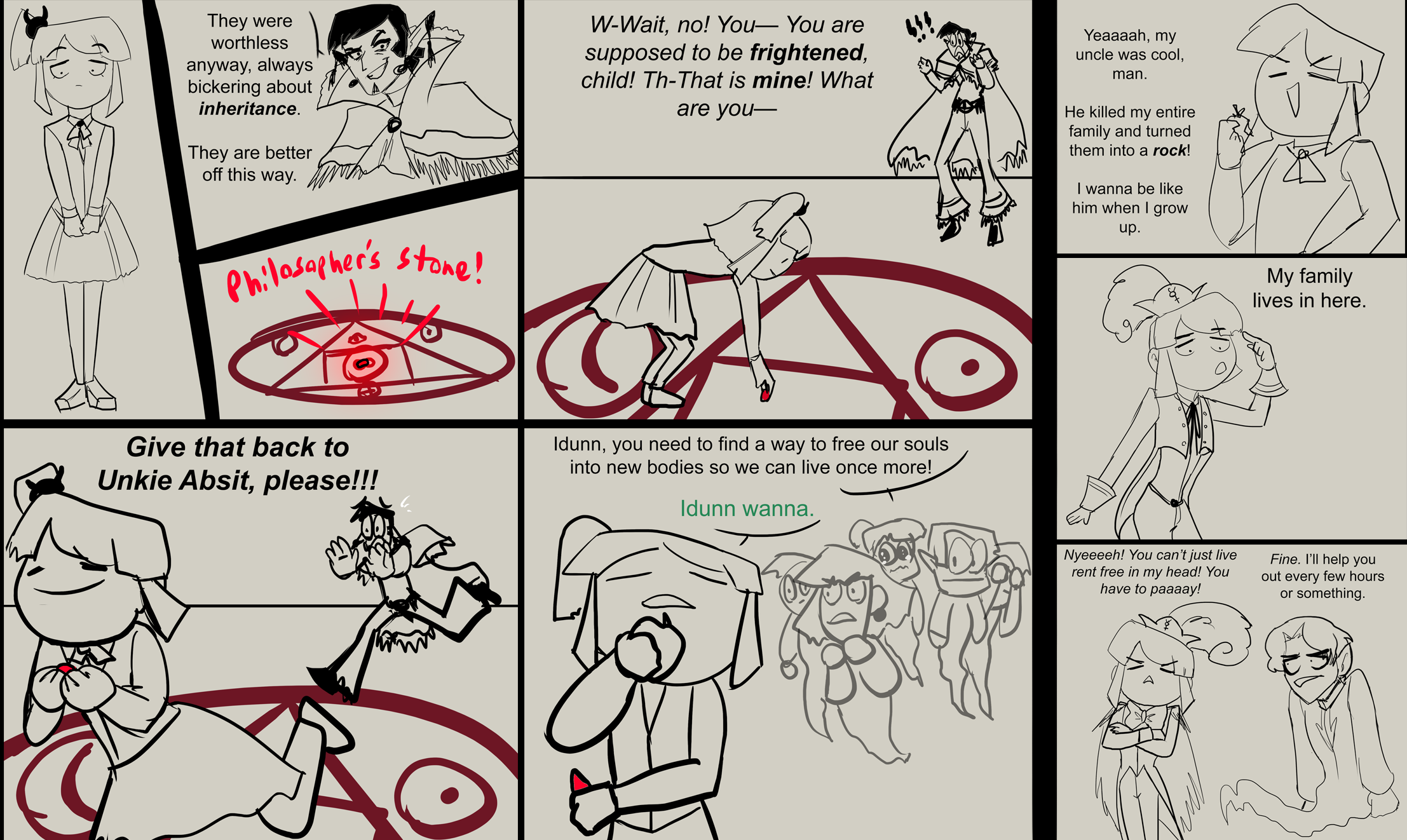 It starts out the same, outside of it being a world with magic, but bickering about inheritance after her grandfather's death leads to Absit snapping. He sacrifices everyone but Idunn (including his own son, accidentally) to create a Philosopher's Stone, in hopes to revive his dad. Idunn walks in on it and steals the stone away, which now contains her family's souls. They keep asking her to find a way to free them, but she doesn't want to. The stone is the source of her Knowledge Cleric powers: her ability to temporarily pick up new skills is getting skills from her family members in the stone.