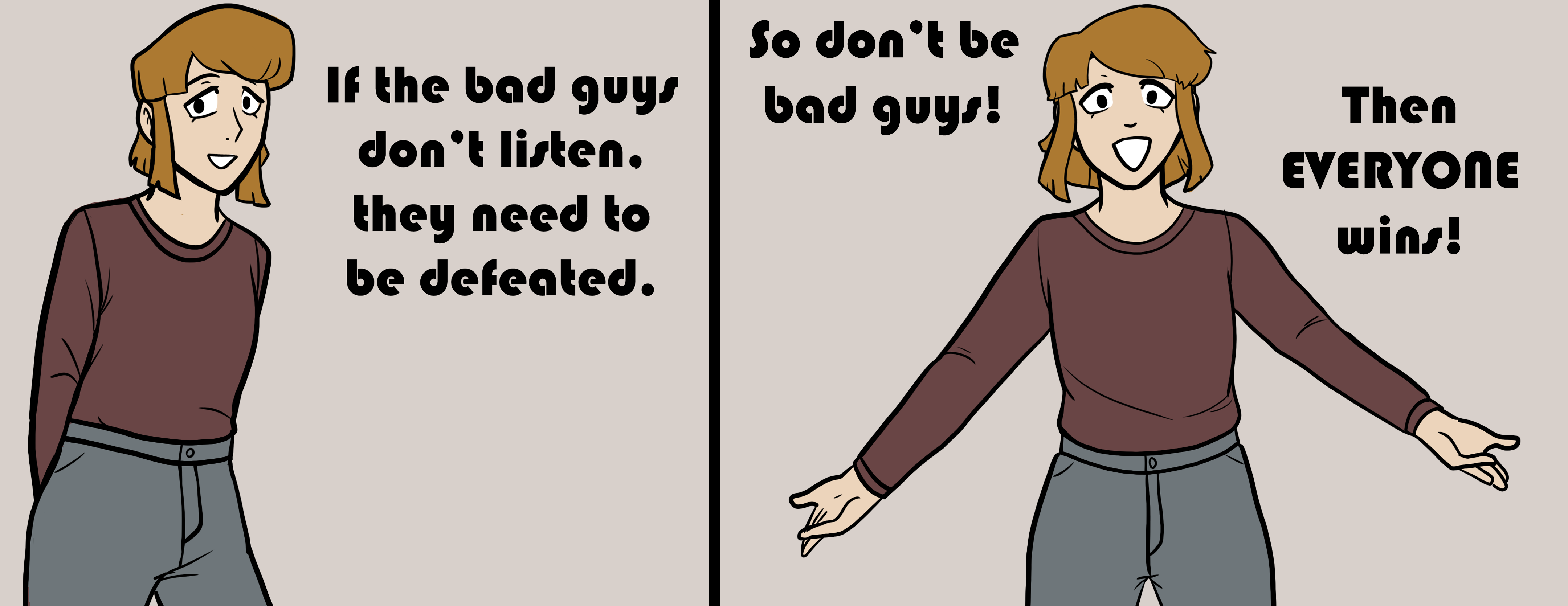 - She's incredibly forgiving, given she takes nothing seriously. Still, she is dangerous, because she doesn't care about anyone else's well-being, outside of the fact that 'things will be less fun if this person were hurt.'