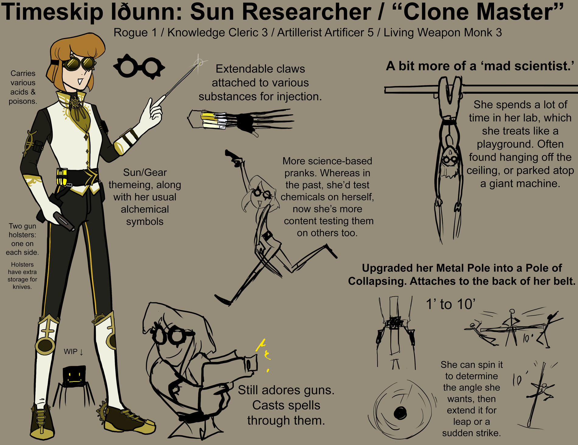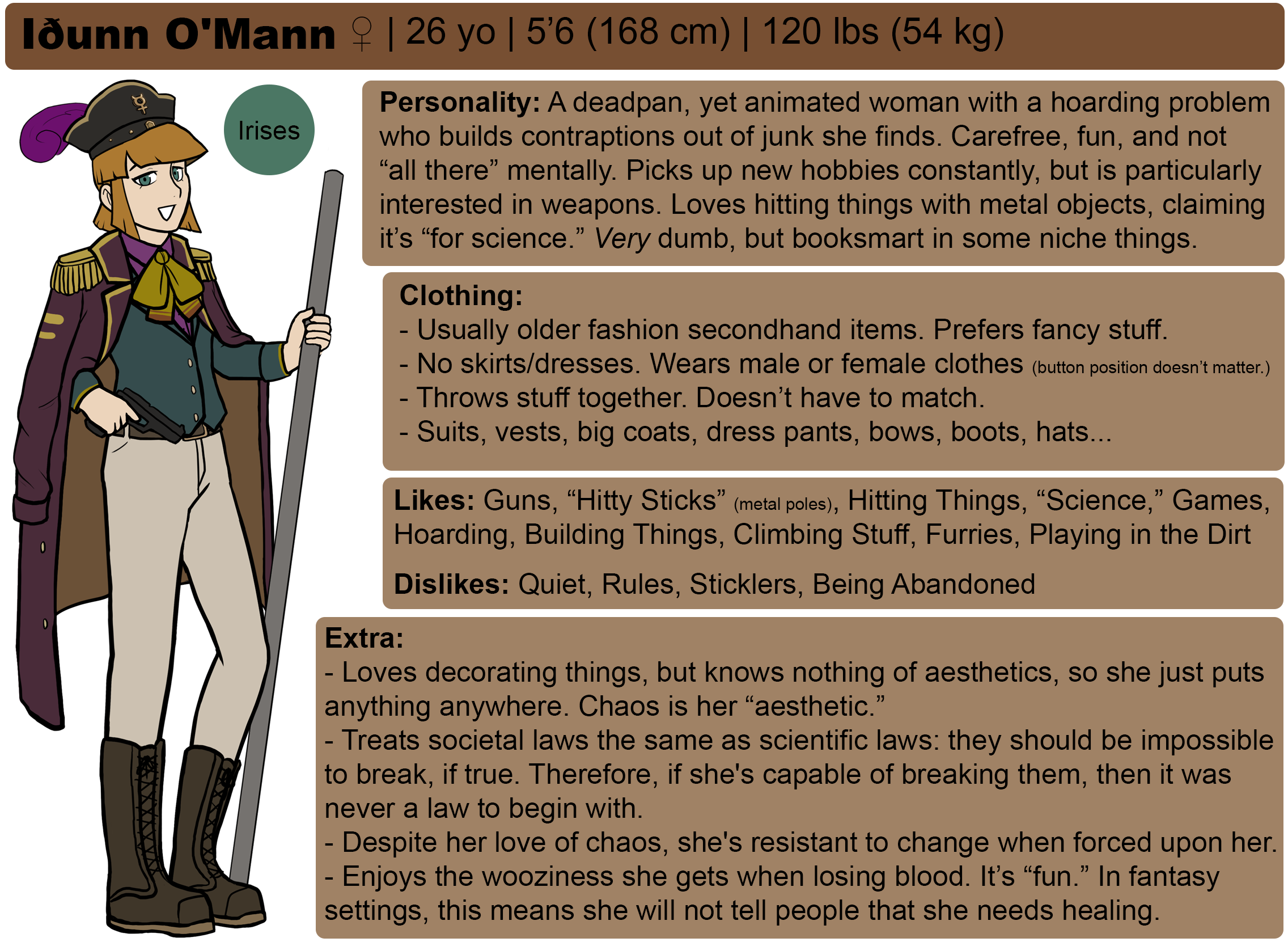 A deadpan, yet animated woman who loves science and odd experiments. Carefree, fun, and not mentally 'all there.' Doesn't take anything seriously, and isn't good at understanding other people's emotions. She loves picking up new hobbies, but has a particularly big interest in weapons, especially guns. Hoards trash and other knick-knacks, and owns an illegal pawnshop (her house), where she sells and trades stuff.