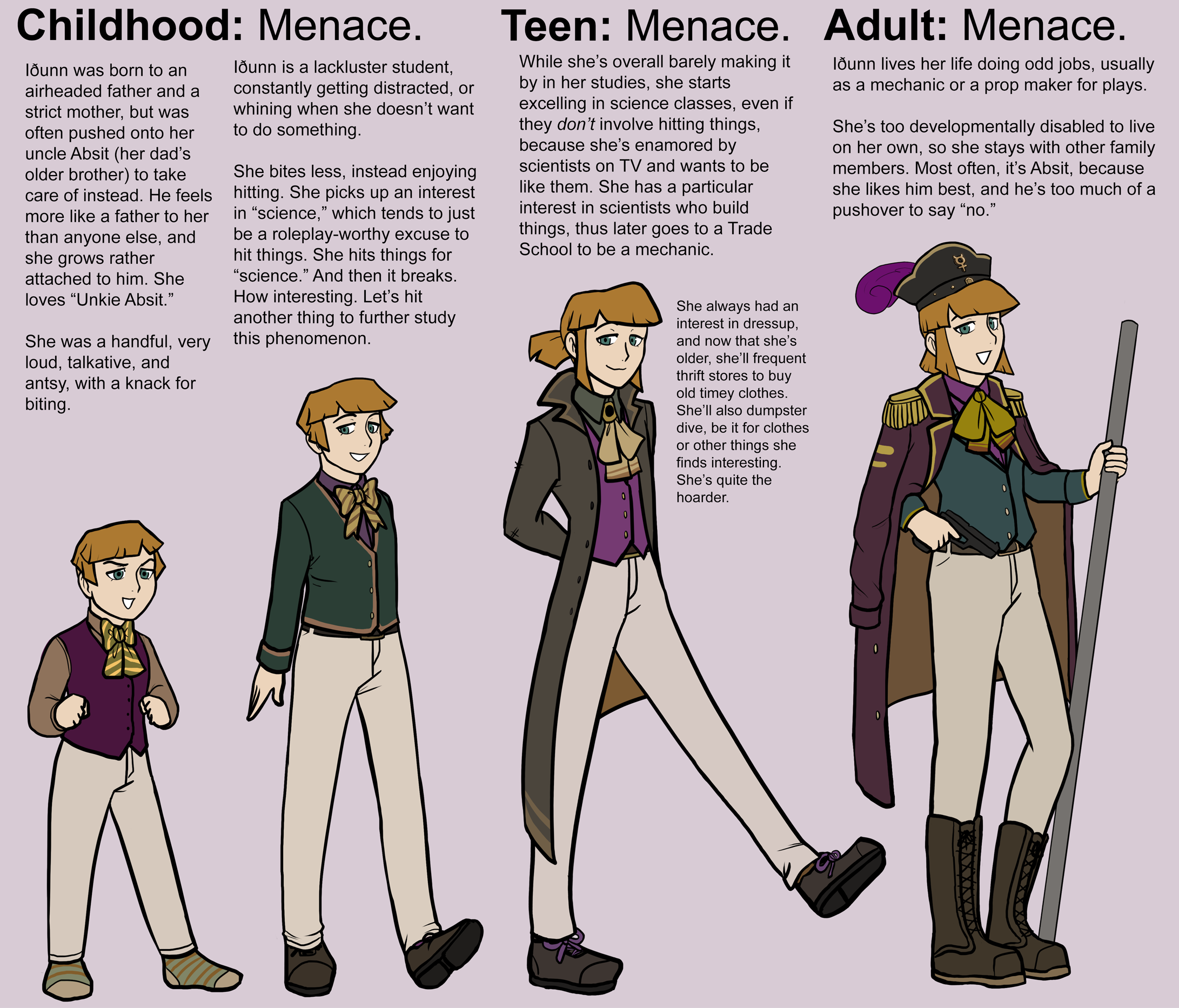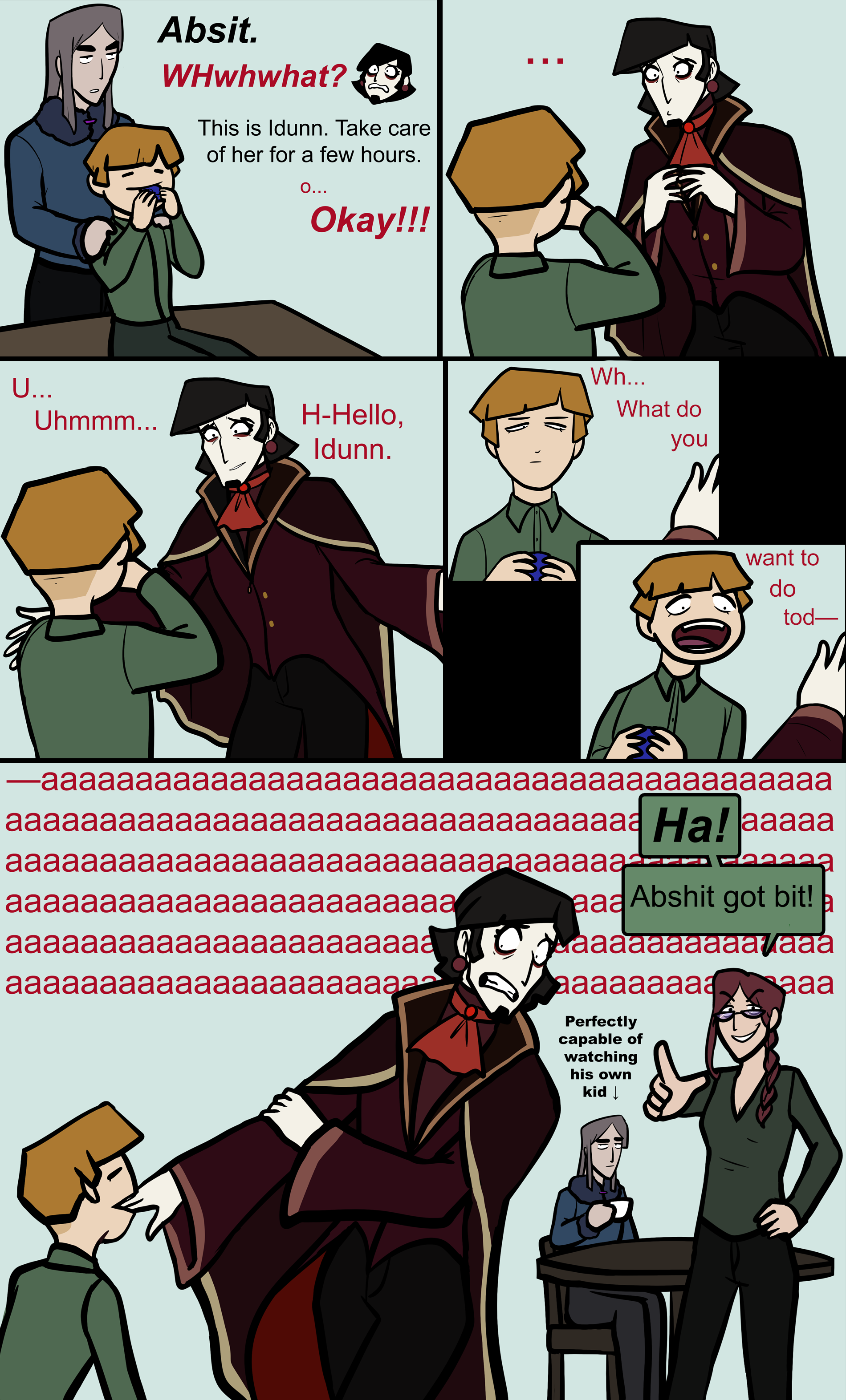 Idunn was always a chaotic gremlin and a pain to her entire family, both nuclear and extended. Her mother scolded her constantly, while her father mainly ignored her, often handing her off to Absit to take care of, because he was too lazy to take care of her himself. Therefore, in a way, Absit was more a father to her than anyone else, despite his intense fear of her.