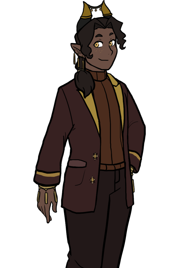 - He is very proud of 'his people' (Sun Elves), after another Sun Elf told him grand stories of their ventures in their old world. Unbenknownst to him, this elf was from an entirely different world. He's not even full sun elf. He's half-Tiefling.