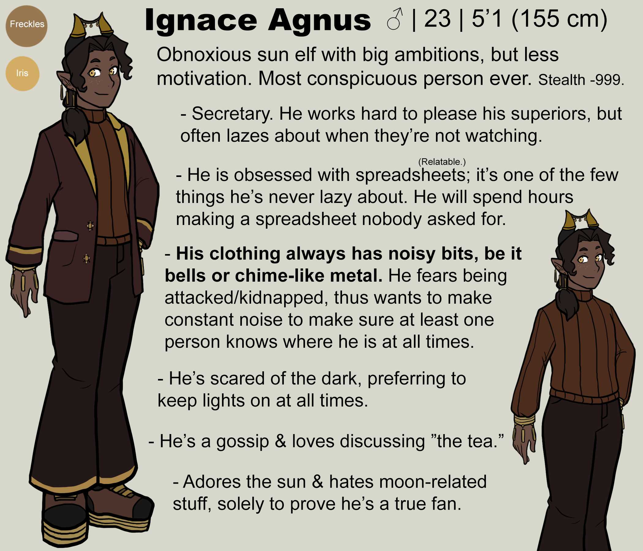 An obnoxious young sun elf with big ambitions, but an off-balanced amount of motivation. He works super hard to please his superiors, but when they're not watching, he can often be found lazing about instead, normally in odd poses. He is very loud, showing little regard for keeping quiet when walking around/moving objects/listening to the radio. His magic also fits this trait, focusing on booming Thunder damage more than anything else.