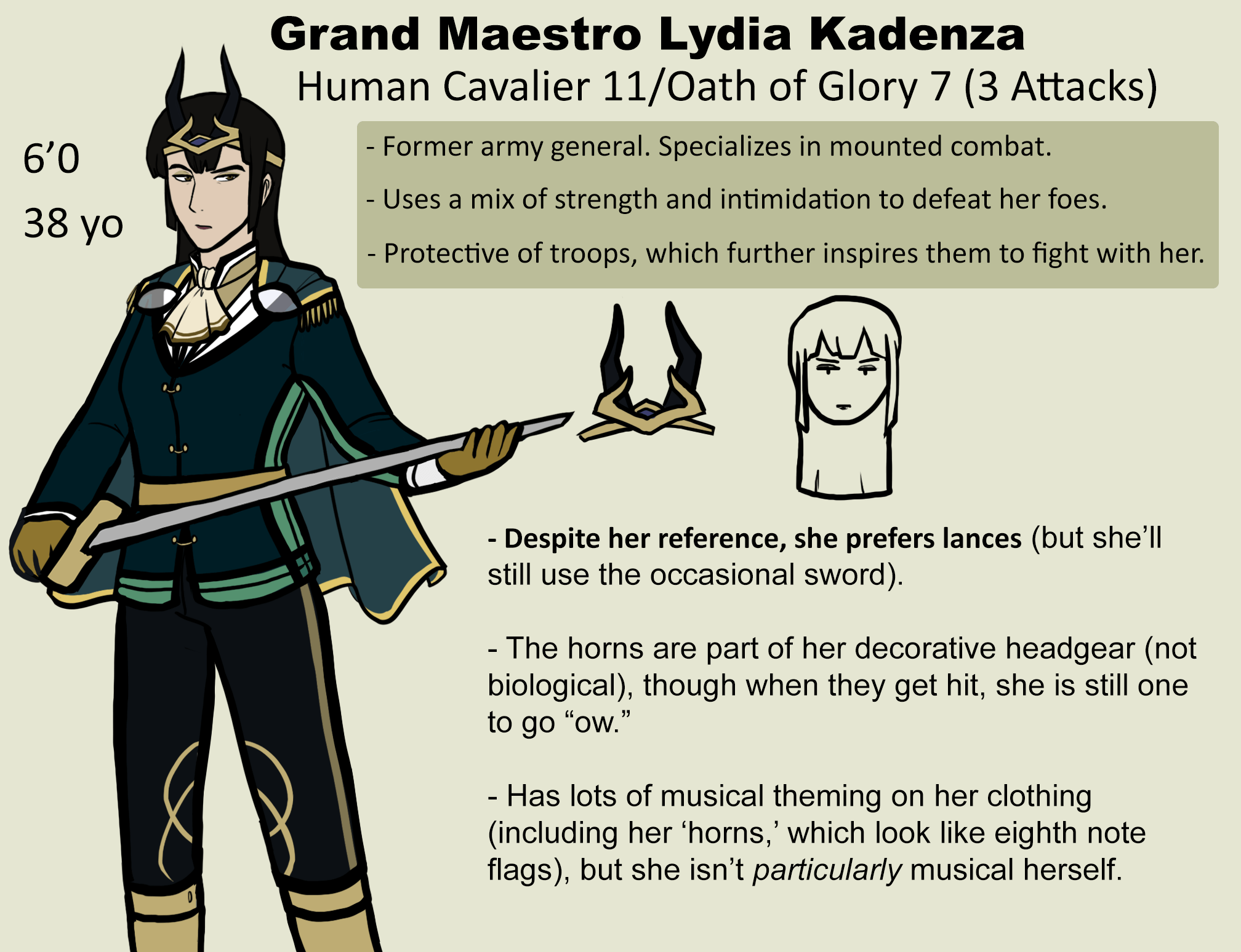 Lydia hails from the Kingdom of Melpomene, a religious nation that relies on a magical set of texts called 'The Score' that lays out the timeline of the world, from past to future. Believing The Score to be the only righteous path (why else would it be written out?), the kingdom would allow atrocities mentioned in the text to go unimpeded, as to not stray from its divine message. But sanctioned atrocities don't go unnoticed. By the time Lydia reaches Colonel status, a civil war breaks out, and being taught to follow orders above all else, she fought for the kingdom, rising up the ranks as her platoons consistently came out on top.