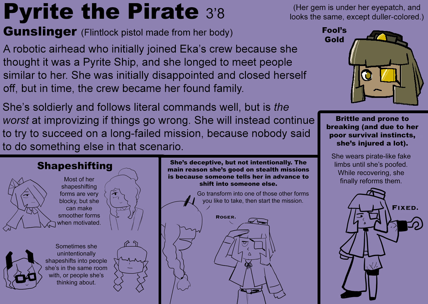She was initially a soldier in her homeworld, but ended up getting horribly lost one day, and while trying to find her way home, she only got more and more lost, wandering for literal months. At some point, she thought she heard there was a 'Pyrite Ship' picking up new crewmembers, and she eagerly joined, but was disappointed when nobody on the ship seemed like a Pyrite at all. In fact, where were these people's gems hidden? They were so oddly colored too. For quite a few years, she kept to herself, normally sitting blankly in the corner of her room until she was ordered on missions, but always trying to help people out, Lambert kept visiting her, and she eventually grew quite attached. From there, she started following him around and opening up to other people, until eventually, the entire crew was her found family, even if she's still not good at expressing it outside of her unintentional shapeshifts into people she likes.