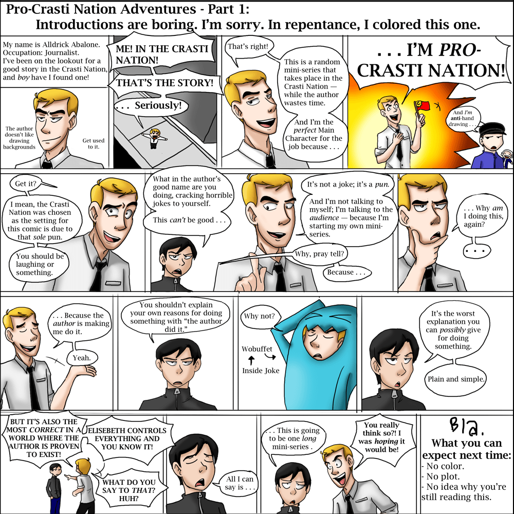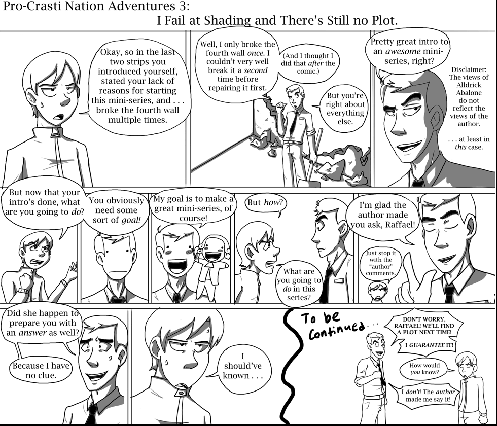 He's forced to star in a Fourth Wall-breaky comic with Alldrick Abalone. He hates it, and is the straight man of the duo. He later gets arrested for terrorism (breaking Fourth Walls).