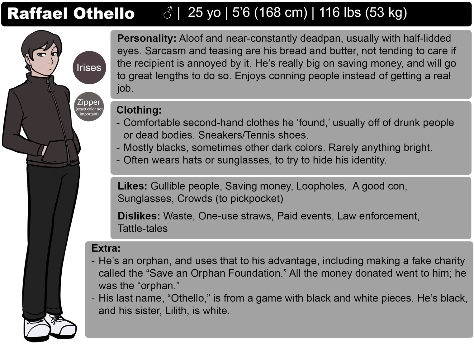He was originally supposed to be the main character, but then I liked Alldrick too much, so now they kind of share the role. He was going to be his normal con artist self, and was fully aware of the fact that they're all in a story. He wanted to be a "hero" as a kid, but then learned that "villains" were needed, in order to keep the world alive (aka, the story going, through conflict), and was forced to become a villain like his father.