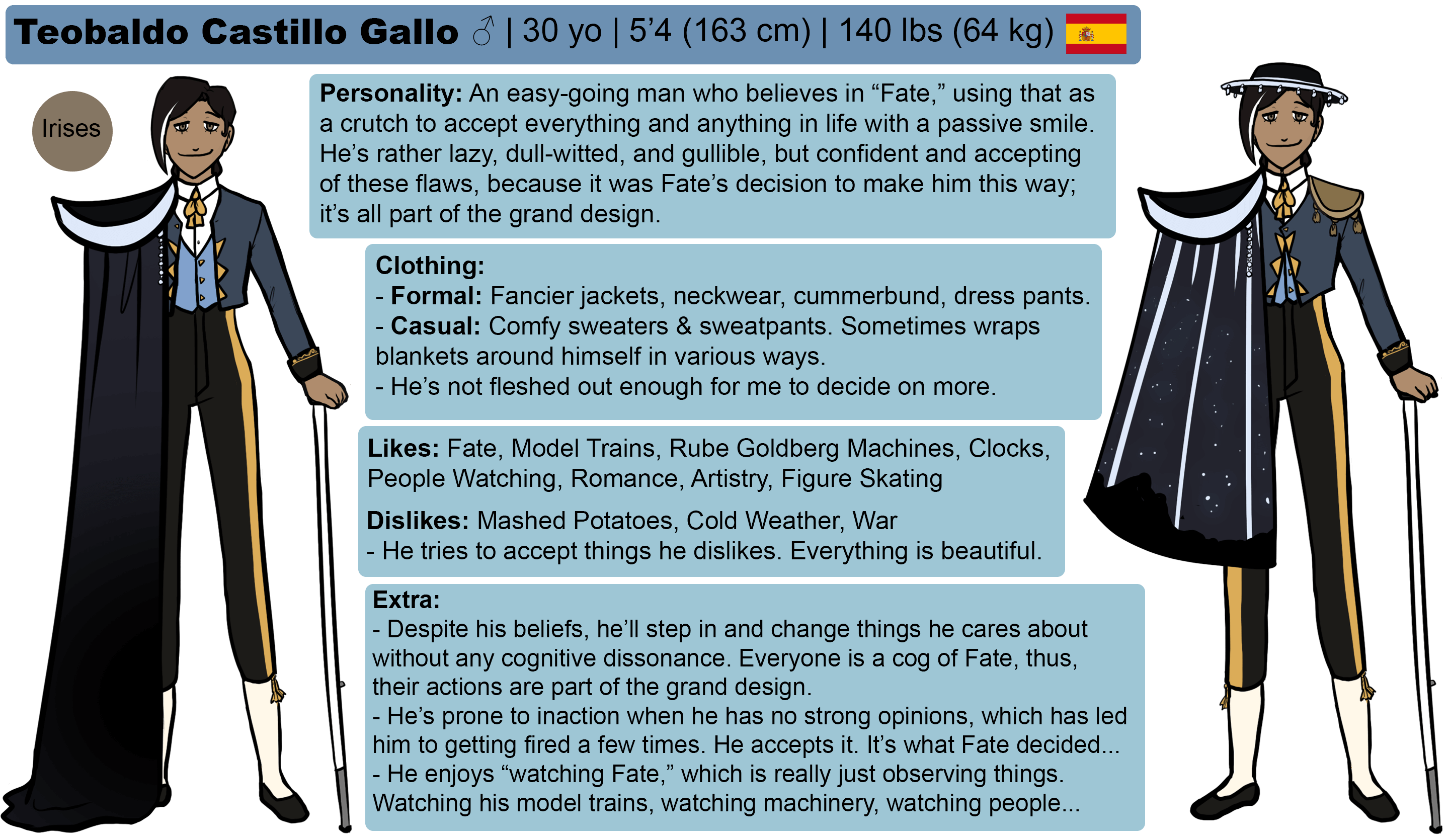 Teobaldo is not fleshed out at all yet, and everything is subject to change. Things are vague because I'm not attached to specifics for him yet.