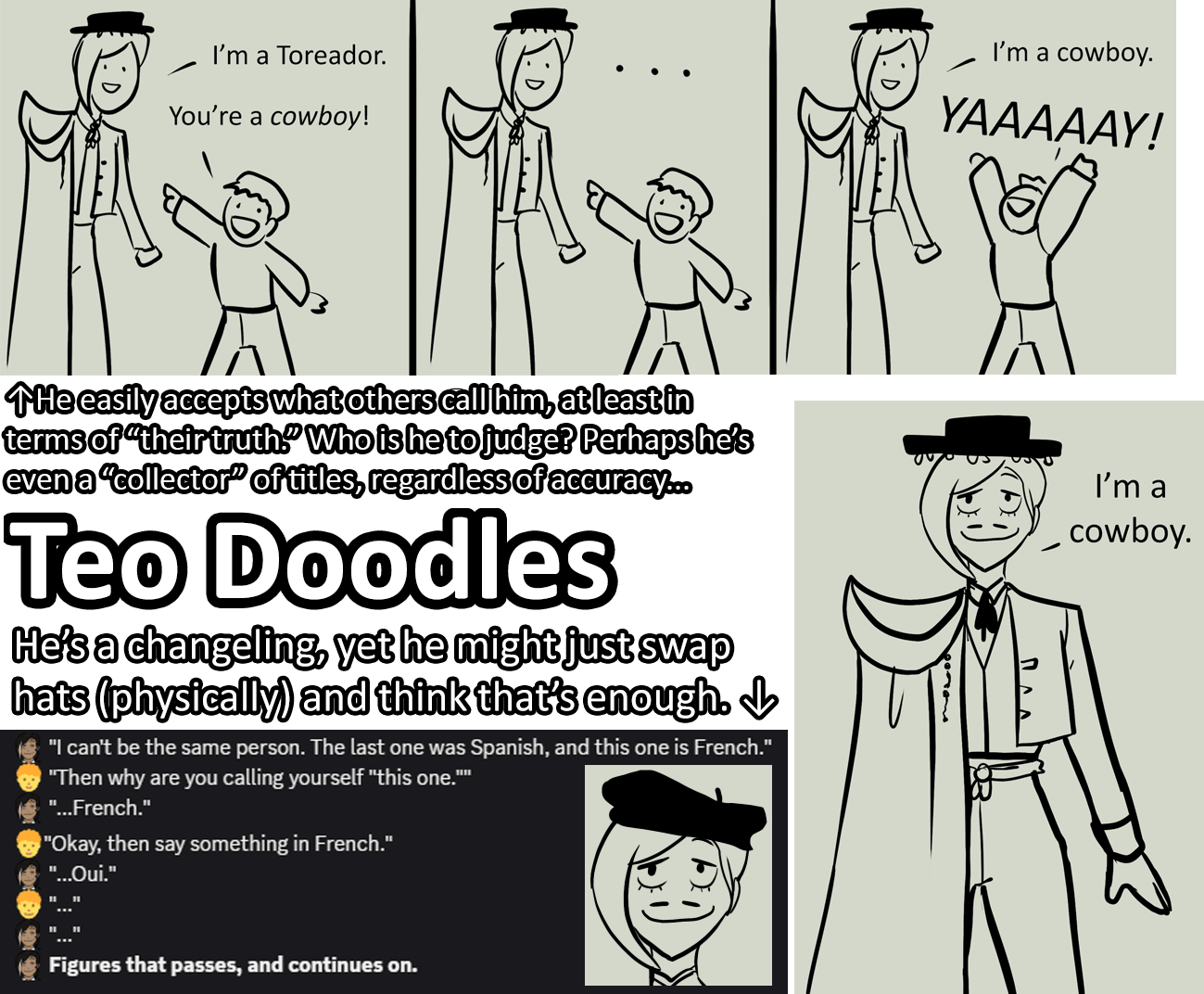 - He is a collector of "truths," aka, labels. He believes nobody's "truth" (beliefs) are above anyone else's, and it would be rude to discard another person's truths. In play, this means he'll take people's words for granted, even when about himself. I consider him tied to the Ship of Theseus due to this, even though his original inspiration was supposed to be the Comedia de Calisto y Melibea.